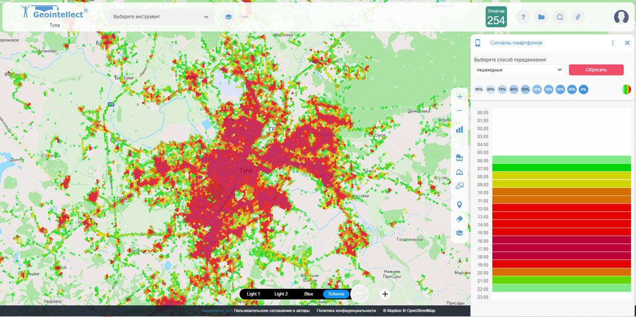 Что делает: Позволяет отфильтровать и проанализировать сигналы смартфонов в конкретной зоне за выбранный период. Зачем нужен: Для оценки реальной проходимости: сколько людей бывает в точке, когда и откуда они приходят. Пример использования: Проверяете торговую улицу на проходимость в обеденное время среди офисных работников. Смотрите, откуда приходят люди — живут рядом или работают.
