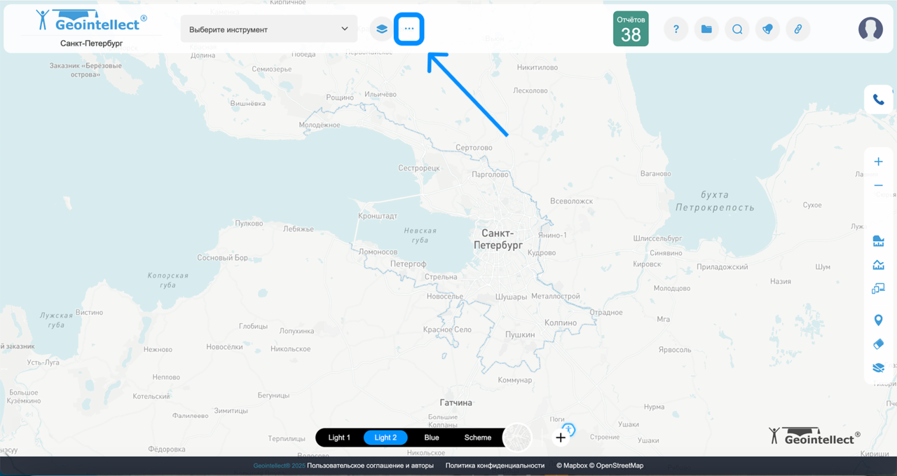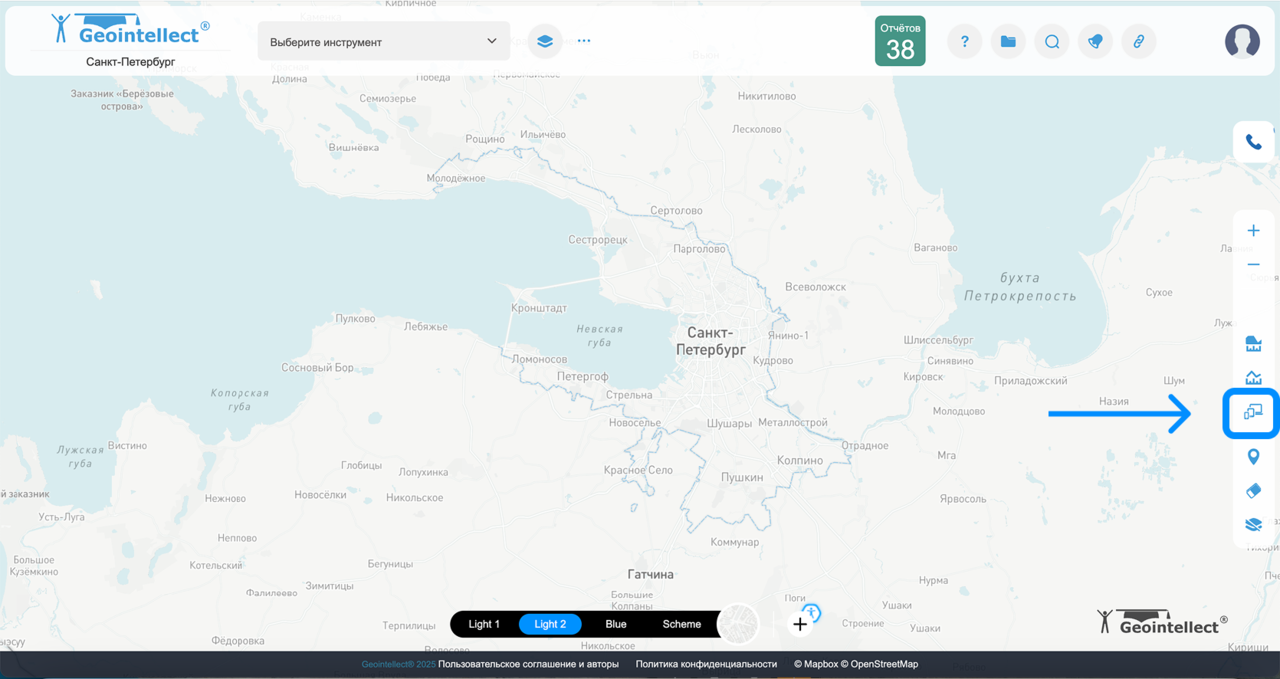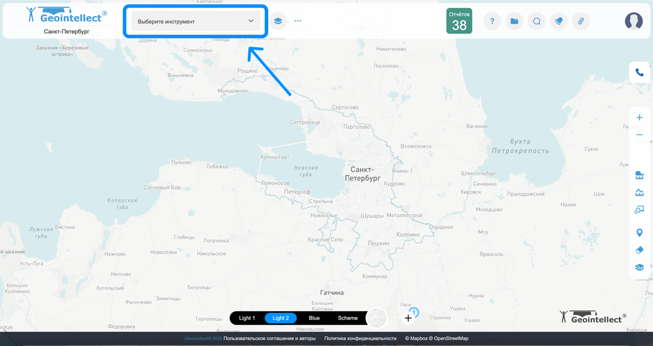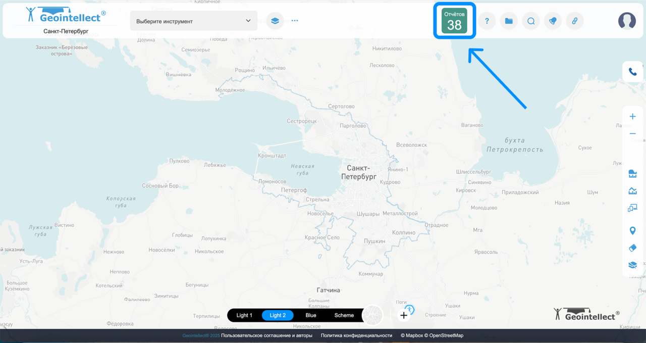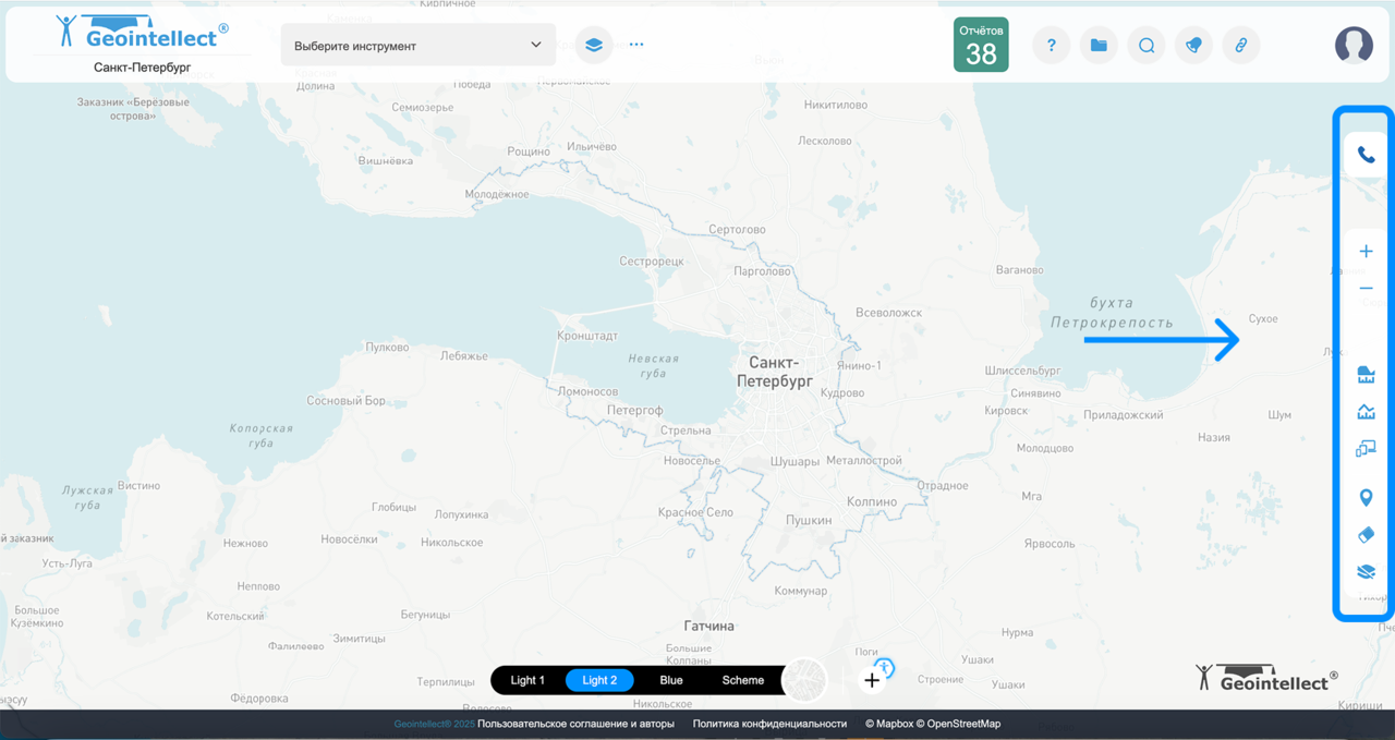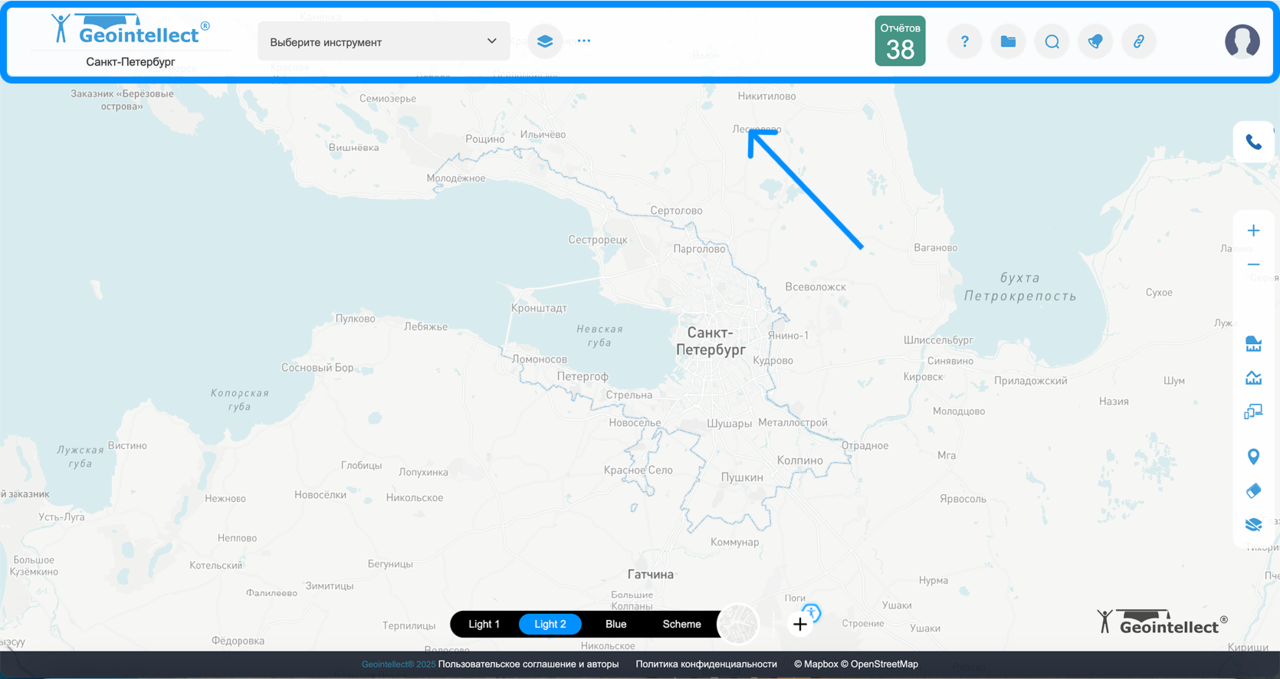 рис 6 - Верхняя панель — управление отчетами, выбор региона, выбор инструментов, выбор слоев геоданных, справочный центр Geointellect, список проектов, поисковая строка, форма обратной связи, копирование, личный кабинет.(рис 7)