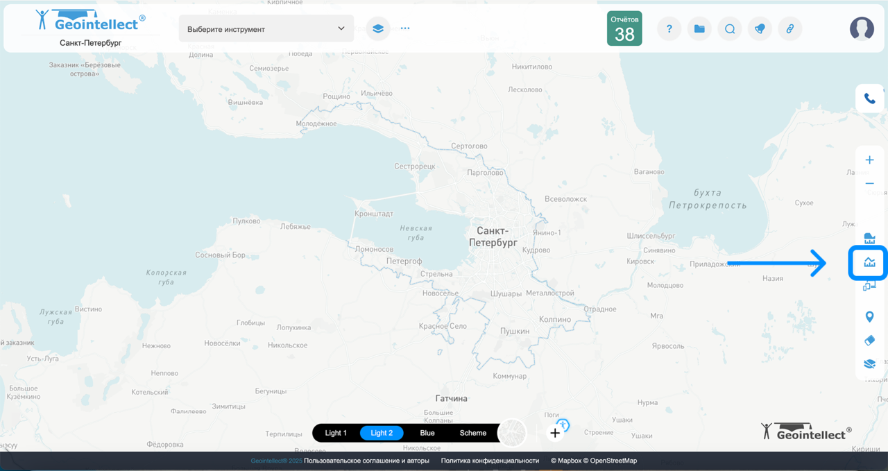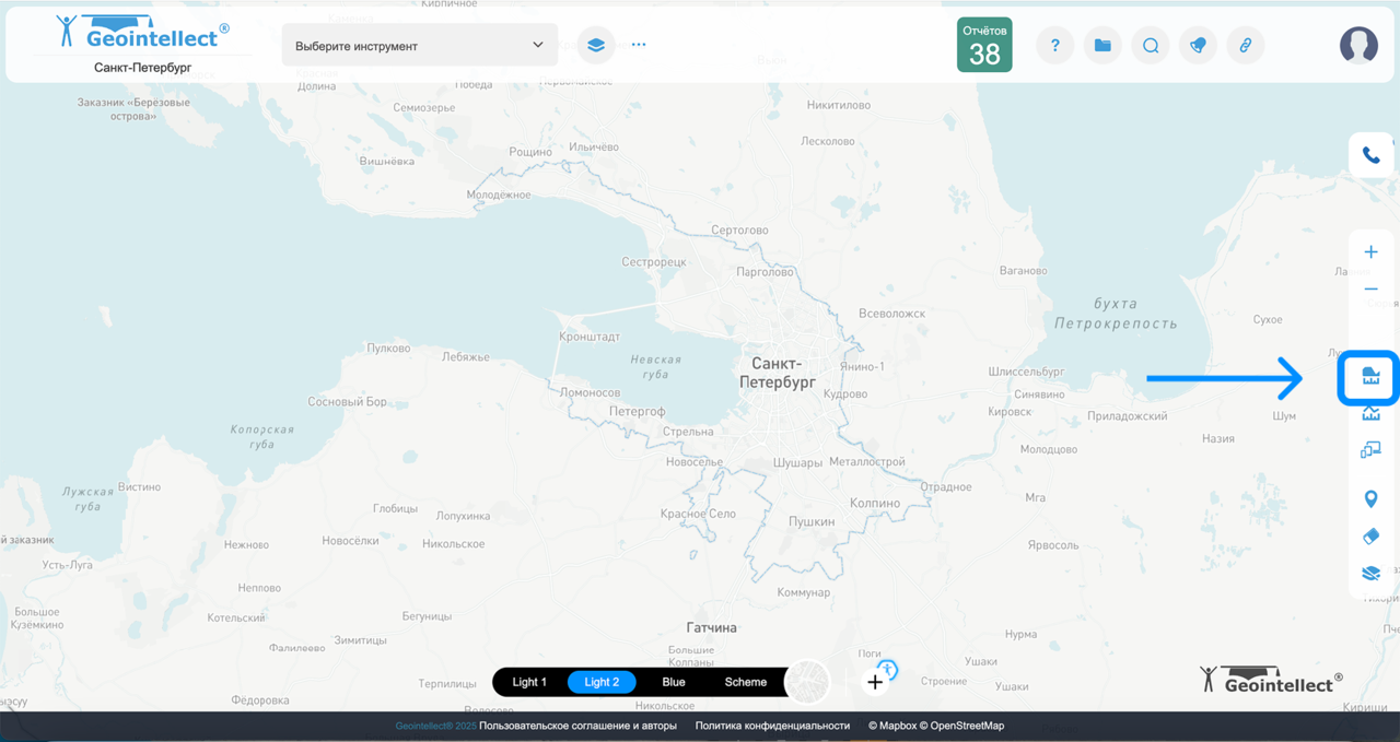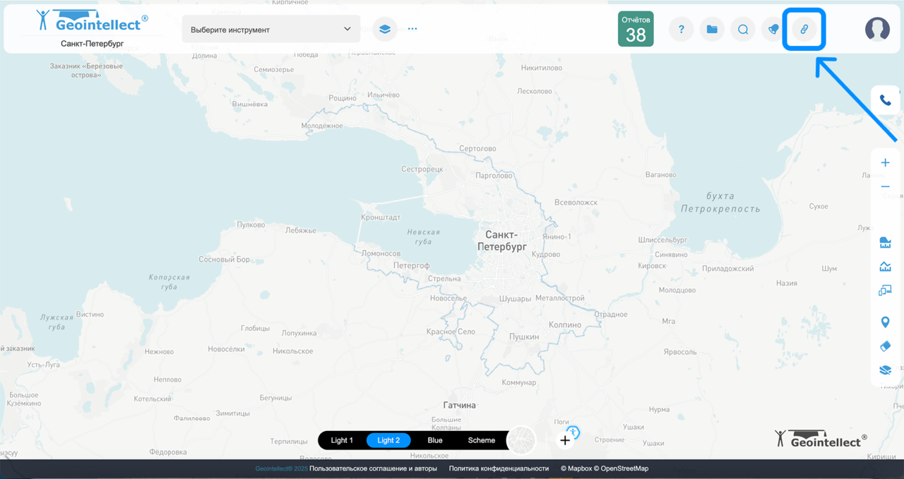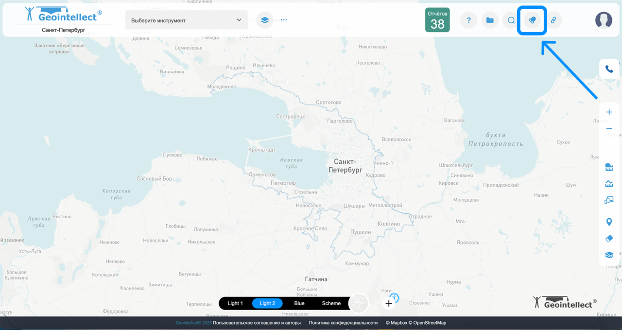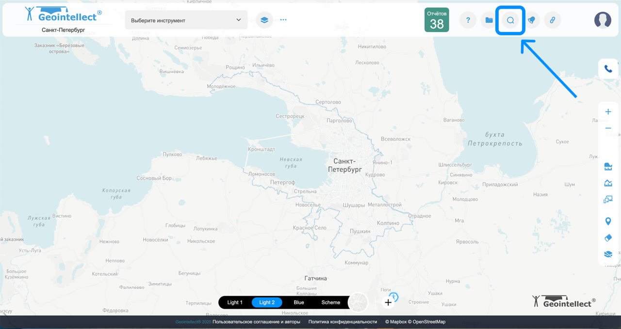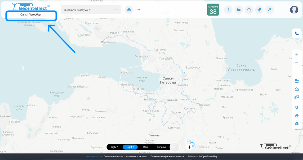 рис 6 - Верхняя панель — управление отчетами, выбор региона, выбор инструментов, выбор слоев геоданных, справочный центр Geointellect, список проектов, поисковая строка, форма обратной связи, копирование, личный кабинет.(рис 7)