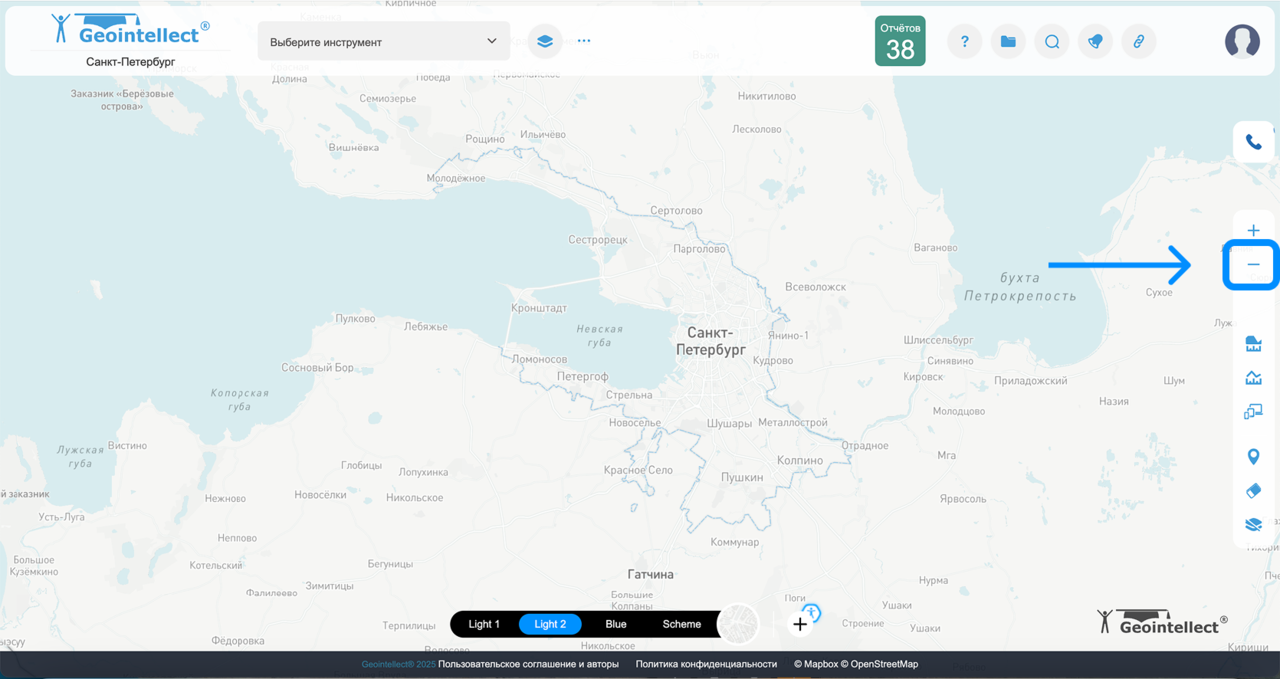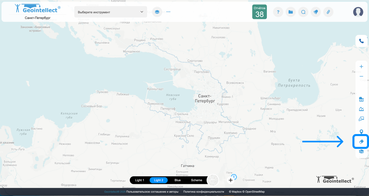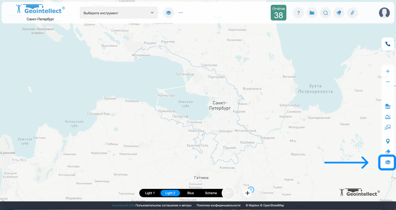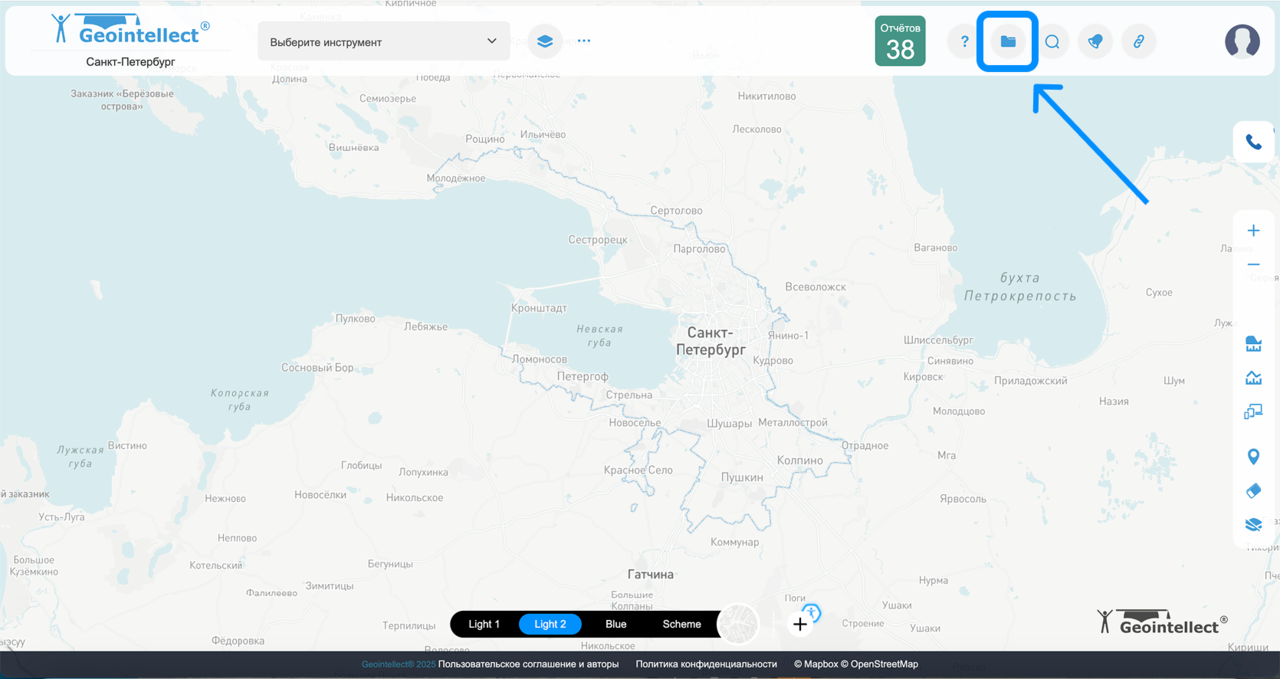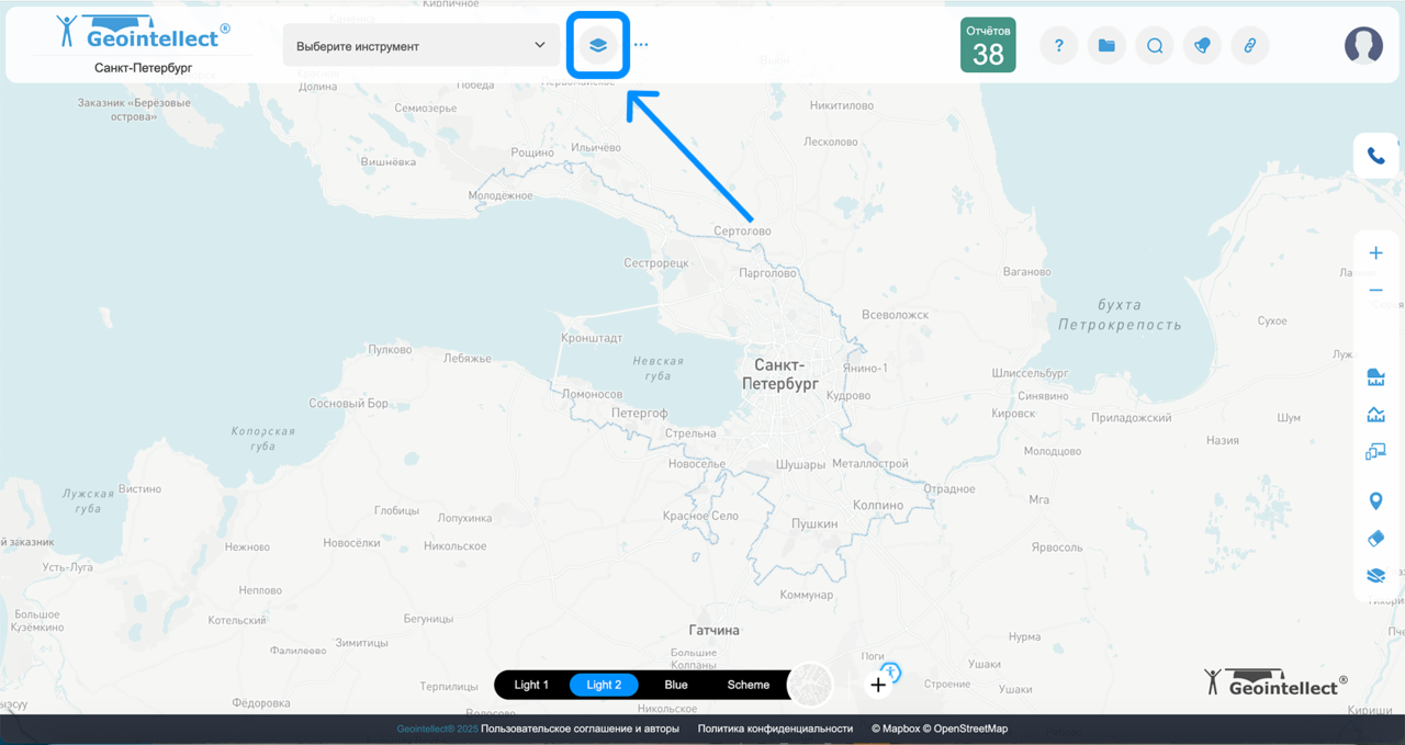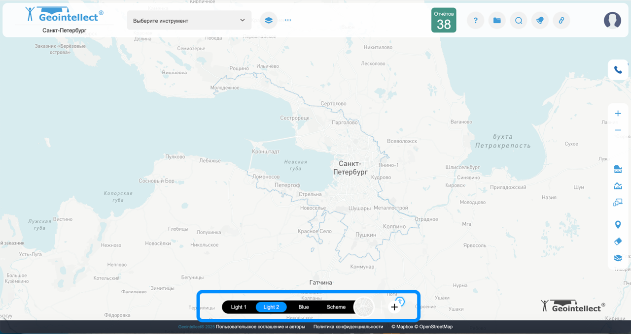 рис 6 - Верхняя панель — управление отчетами, выбор региона, выбор инструментов, выбор слоев геоданных, справочный центр Geointellect, список проектов, поисковая строка, форма обратной связи, копирование, личный кабинет.(рис 7)