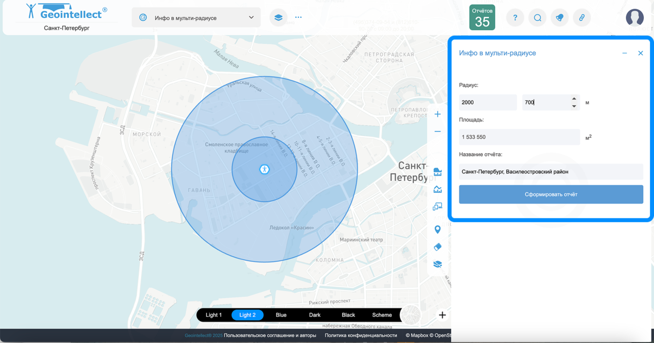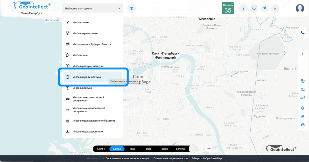 Инфо в мульти-радиусе – инструмент для анализа территории с несколькими настраиваемыми радиусами. Позволяет одновременно исследовать несколько зон влияния разного размера из одной точки, получая детальные данные по каждому радиусу.