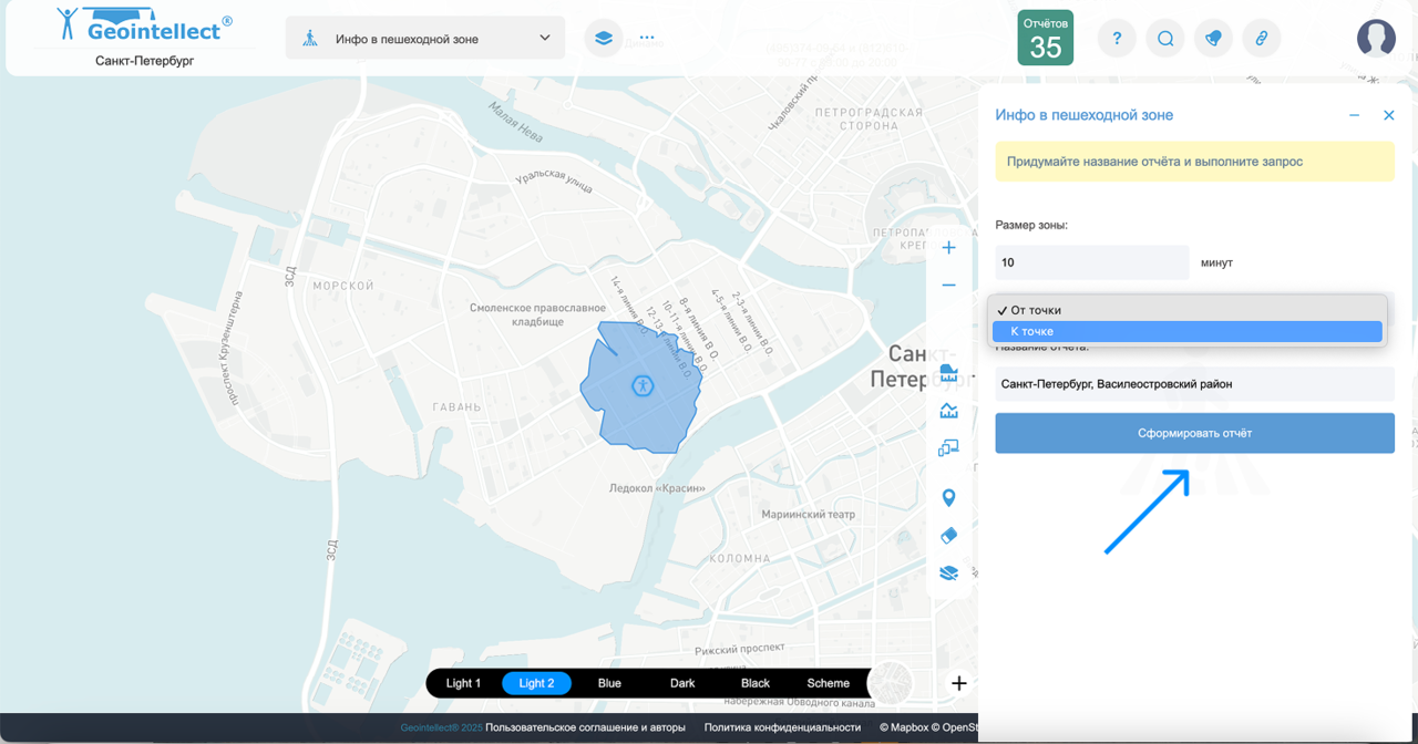 - После построения зоны вы можете перейти в меню → Раздел «Отчёты», где будет доступен отчёт по вашей зоне.