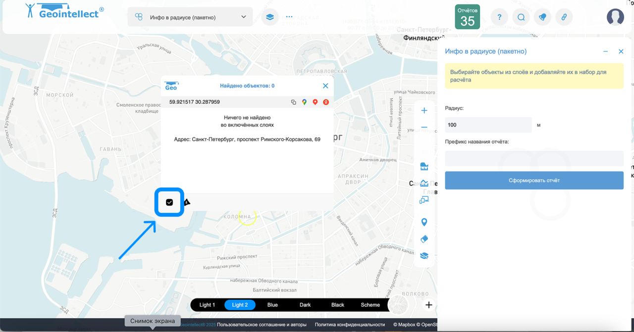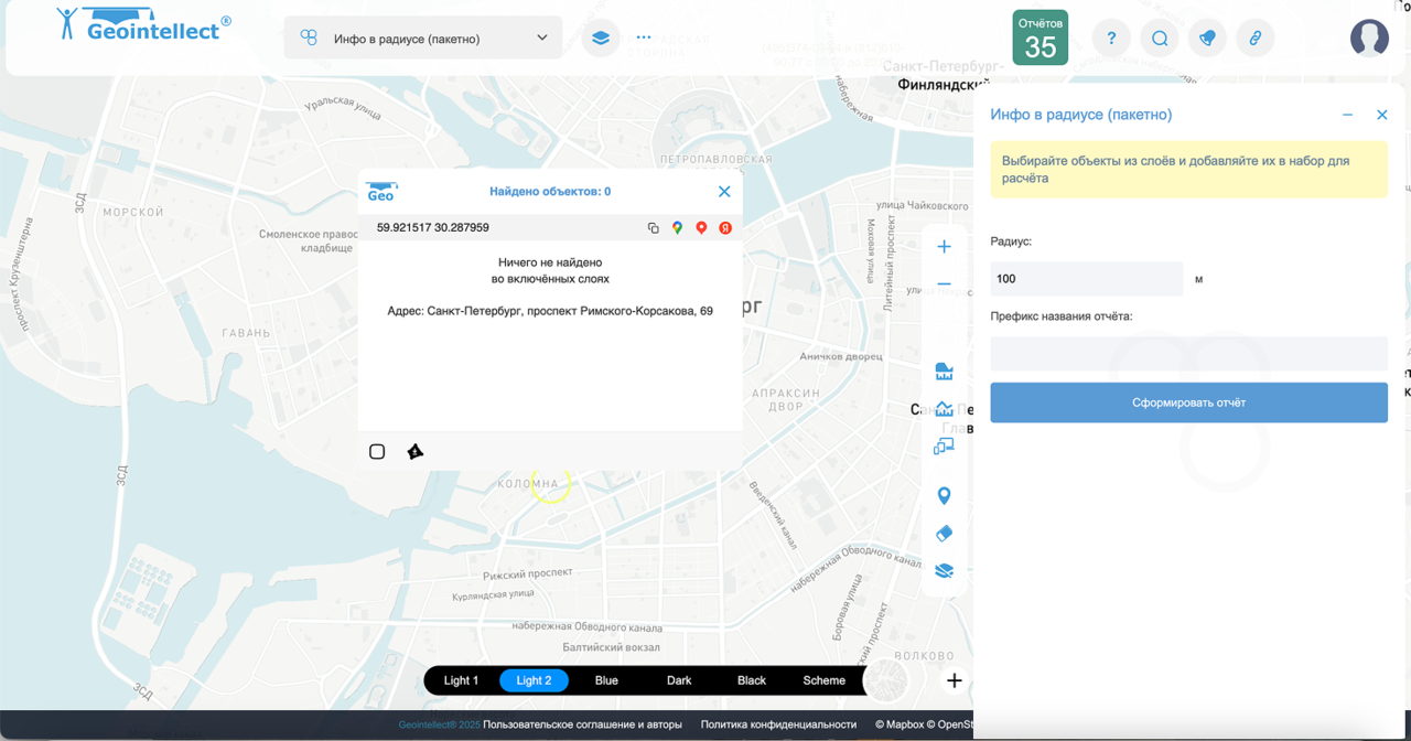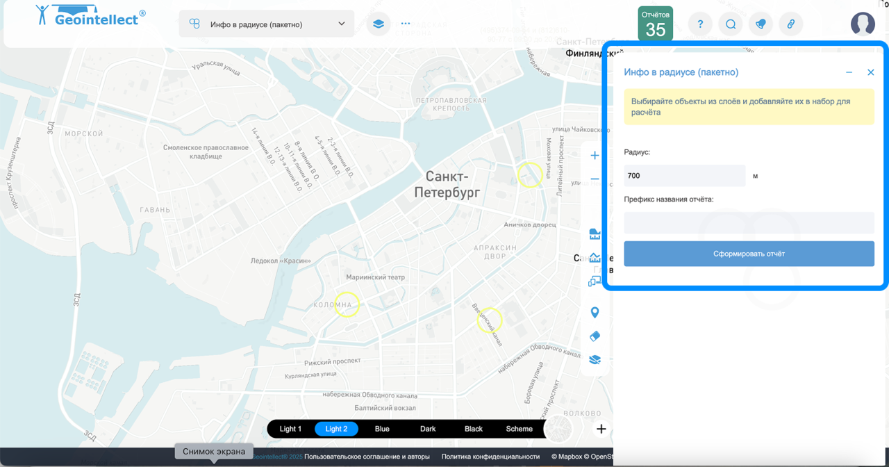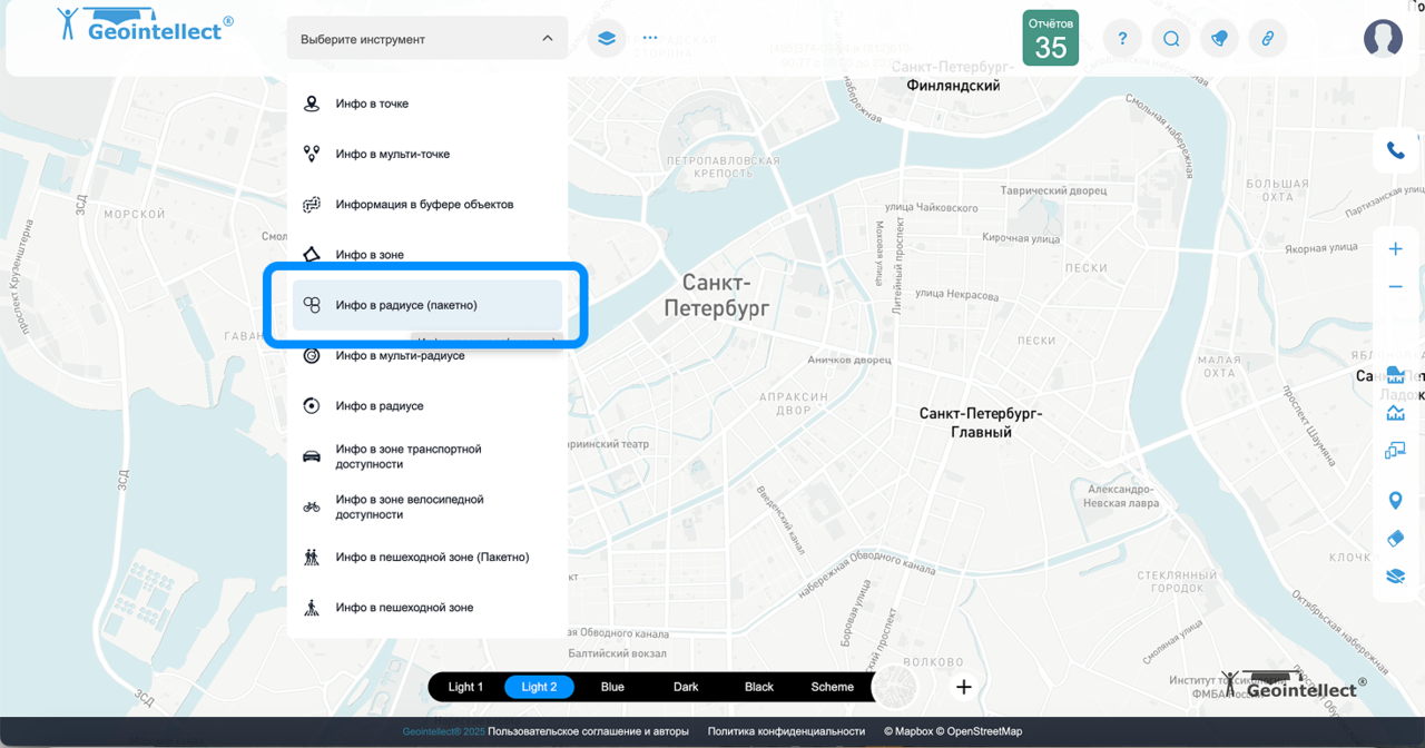 Инфо в радиусе (пакетно) — инструмент для пакетного анализа нескольких точек. Позволяет одновременно проанализировать сразу несколько локаций по радиусу вокруг заданных точек.