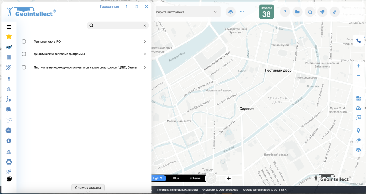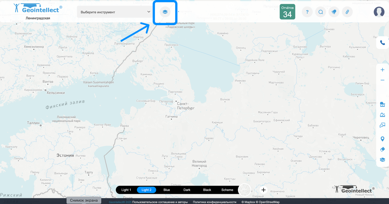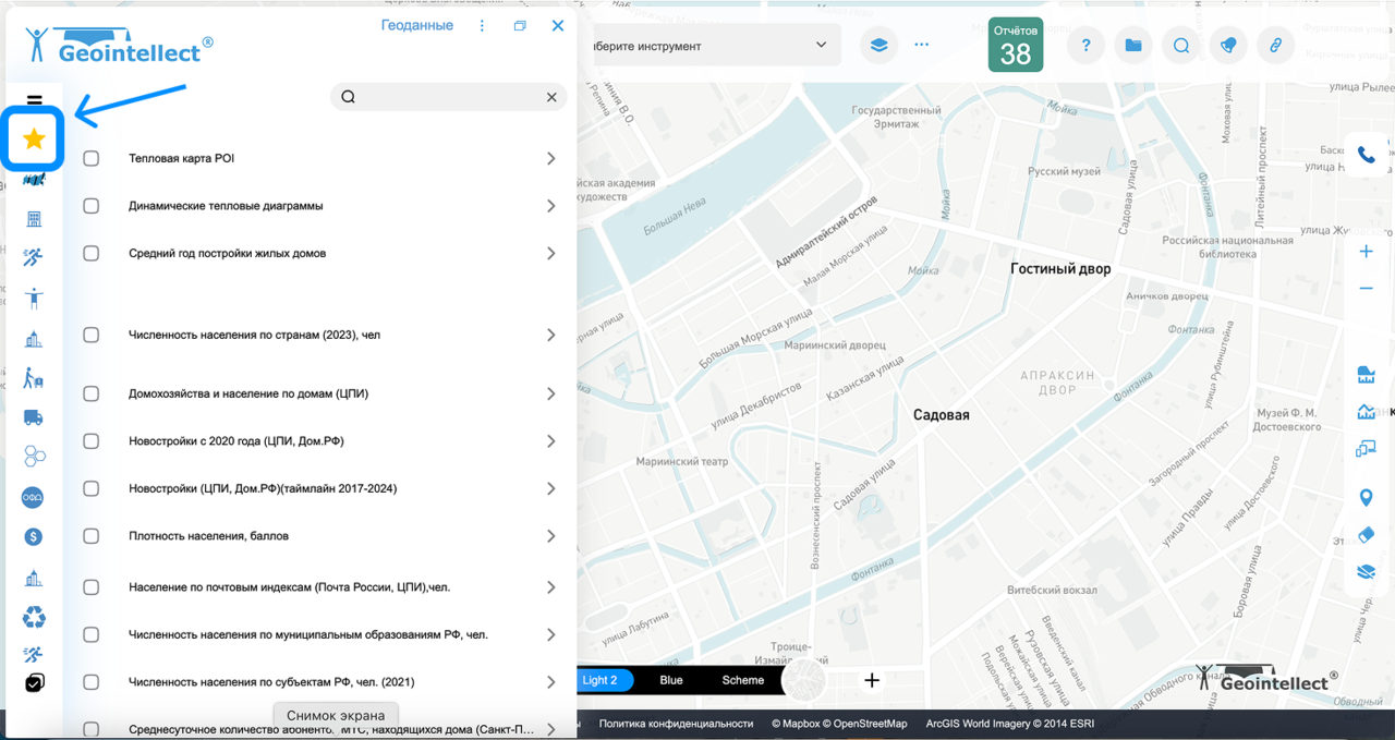 Инструмент «Избранное» позволяет быстро находить и управлять слоями геоданных, которые вы используете чаще всего. Это удобный способ не теряться в большом списке слоёв, а работать только с тем, что действительно важно. Как найти инструмент?# Откройте сайт https://geointellect.com и войдите в свою учётную запись. Вы попадёте в основное рабочее окно платформы с картой и панелью инструментов. (рис 1) На левой верхней панели инструментов найдите значок с многоугольником. (рис 2) рис 1рис 2 В открывшемся окне в левой вертикальной панели выберите значок со звездочкой(рис 3) рис 3рис 4 Как добавить слой в «Избранное»# Откройте список слоёв. Найдите нужный слой и нажмите на значок «звёздочки» рядом с ним. ⭐ Это добавит слой в ваш список «Избранное». Похожие инструменты