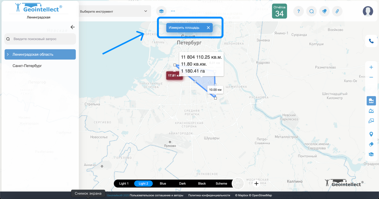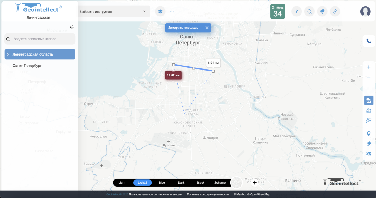 Инструмент «Измерение площади» позволяет вручную задать произвольную зону на карте и моментально получить её площадь. Это удобно при предварительной оценке территорий, которые ещё не имеют чётких границ или только рассматриваются под проект.
