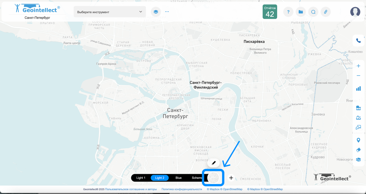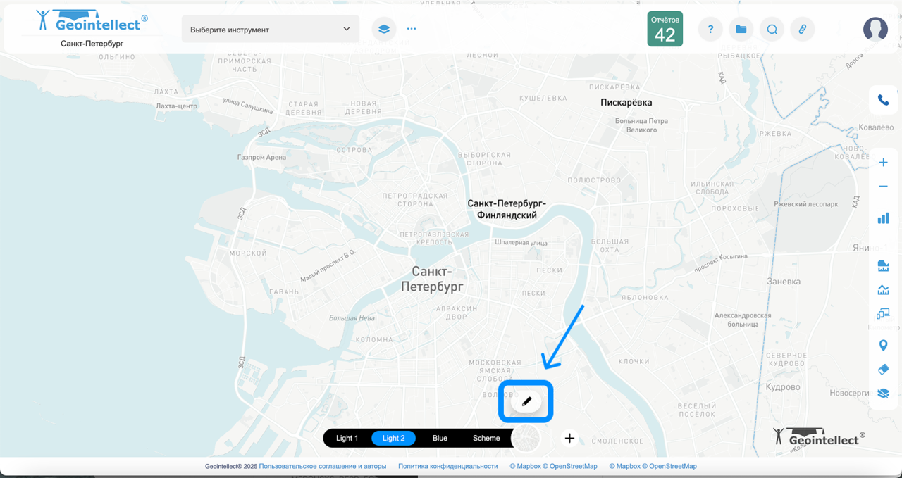 2. Вы попадёте в основное рабочее окно платформы с картой и панелью инструментов. (рис 1)