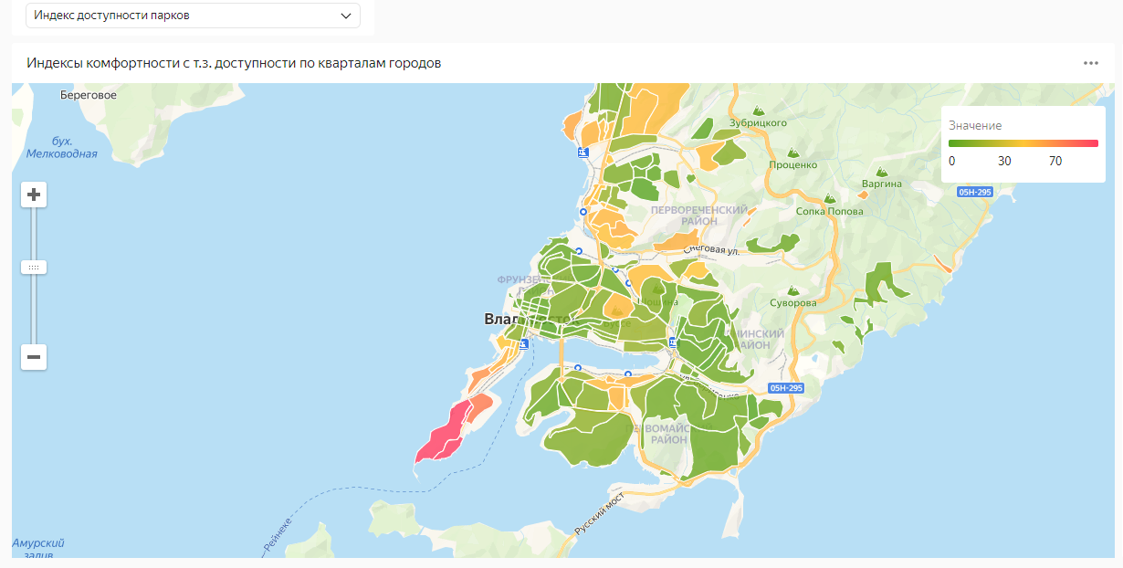Также индексы комфортности строились по заказу для многих других городов: Хабаровск, Архангельск, Мурманск, Магадан, Якутск, Улан-Удэ, Чита, Благовещенск, Южно-Сахалинск, Анадырь, Владивосток, Петропавловск-Камчатский и Биробиджан. На картинке ниже изображен урбан парков по Владивостоку в DataLens. Его можно скачать из DataLens Marketplace.