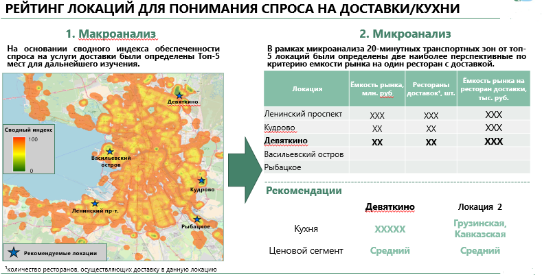 При насыщенном рынке в городе, таких локаций может и не быть. Это тоже результат. Тогда на данном этапе, «копают» еще глубже в том, числе, борются за время доставки по сравнению с конкурентами, сервисом для населения и пр.