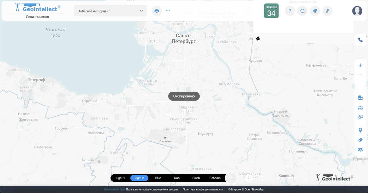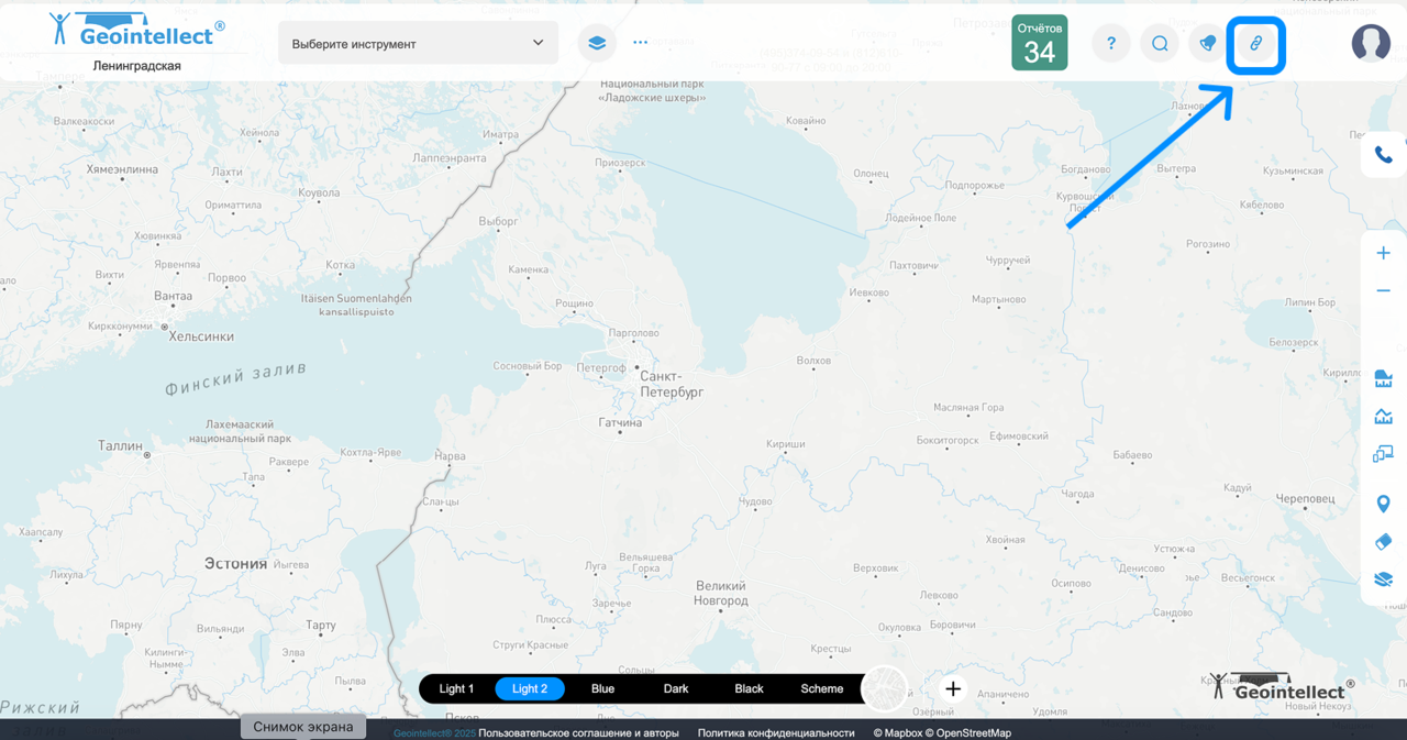 Инструмент «Скопировать ссылку на карту» позволяет быстро сформировать прямую ссылку на текущую сцену: с выбранным масштабом, центром карты, а также наложенными слоями. Удобно для отправки коллегам или для сохранения нужного положения карты.