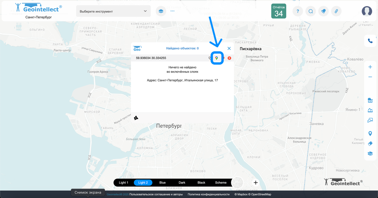 Инструмент позволяет перенести выбранную точку с карты Geointellect прямо в Google Карты, чтобы воспользоваться функциями этого сервиса: построить маршрут, посмотреть панораму, найти рядом объекты и т.д.