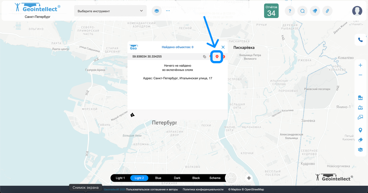 Инструмент позволяет перенести выбранную точку с карты Geointellect прямо в Google Карты, чтобы воспользоваться функциями этого сервиса: построить маршрут, посмотреть панораму, найти рядом объекты и т.д.